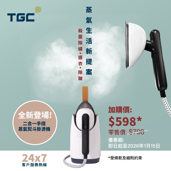 即日起至2026年1月15日,凡購買TGC / SIMPA / Mia Cucina產品或家居用品,即可以$598優惠價加購TGC 2合1手提蒸氣熨斗掛燙機TGS150一部,更可同時獲贈摺疊式熨板及隔熱手套各一塊。優惠期有限,立即把握機會入手,向摯愛傳遞節日祝福,享受升級護衣體驗!