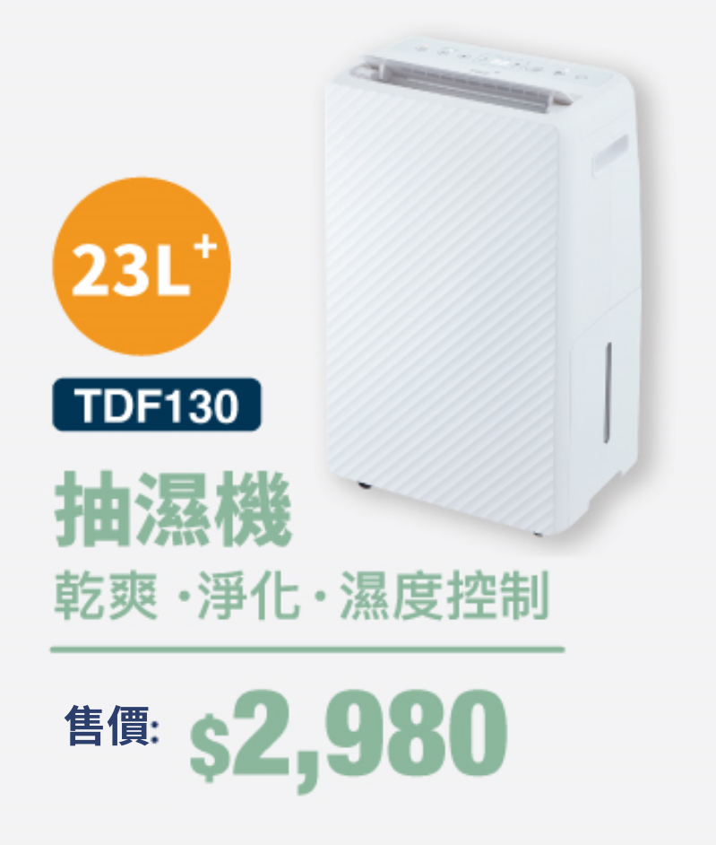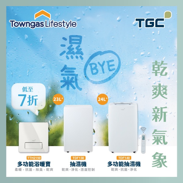 回南天一到,濕度急升,家居即變「水簾洞」!牆身地板「出水」、天花出現霉斑、家具受潮變形、衣物難乾兼散發陣陣難聞「噏味」,潮濕環境更易成為細菌、霉菌、塵蟎與其他致敏原的「天堂」,隨時誘發氣喘、支氣管炎、過敏性鼻炎等問題,影響一家大小健康!面對潮濕大敵, TGC特別推出春日家電優惠*,精選抽濕機7折起,多功能浴暖寶加購優惠價僅需$2,280,全部均獲1級能源效益認證,更包3年保養服務,助您輕鬆擊退春日濕氣,重拾乾爽舒適的家居環境!