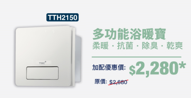 現購買任何TGC/ SIMPA / Mia Cucina 產品及或家居用品,只需以優惠價$2,280即可加購TGC多功能浴暖寶TTH2150一部,更可享窗口式標準安裝半價($240)。把握機會入手,與抽濕機雙劍合璧,徹底解決全屋潮濕問題!