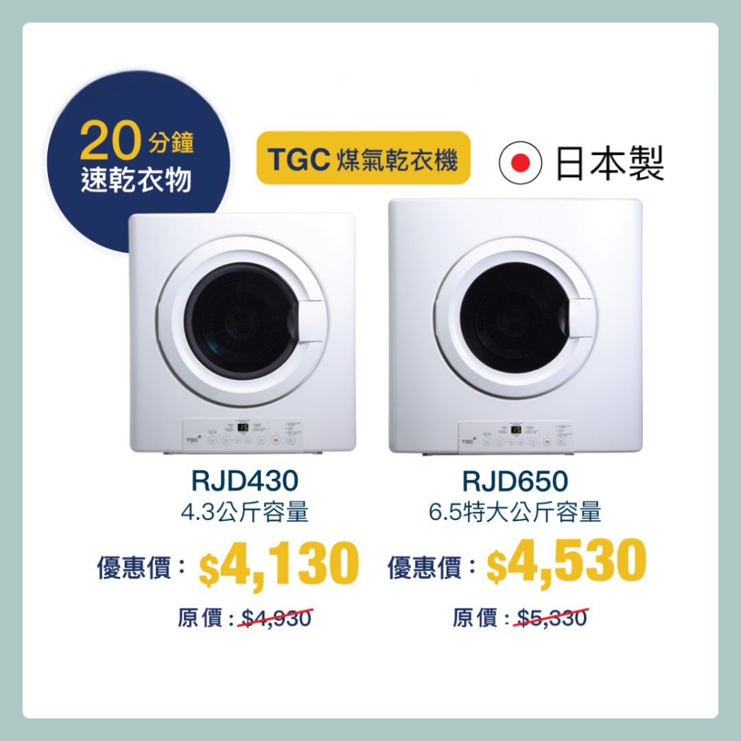 想乾衣、除菌、除蟎、除霉一步到位,家中當然必備煤氣乾衣機!日本製TGC煤氣乾衣機以高效熱循環技術乾衣,只需45分鐘^即可高溫極速乾透4公斤衣物,烘乾時可提升至高達80°C 的高溫,有效殺滅常見家居細菌如大腸桿菌及霉菌#,輕鬆擊退噏味及細菌,守護一家人的健康。此外更特設20分鐘「速乾」功能,瞬間烘乾1公斤衣物,從此晴天全年無休,無論任何時刻都可以擁抱乾爽好心情。即日起至2026年5月15日前選購TGC煤氣乾衣機,即可享現金折扣高達$800*,更可免費獲贈安裝架(價值$760)及排濕喉(價值$450)。