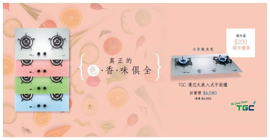 打造活力色彩的廚房 真正的「色」 、香、味俱全 TGC嵌入式平面爐夏日優惠 夏天,就是繽紛色彩! 今個盛夏,TGC為你重新定義真正的「色」香味俱全。TGC多款不同顏色的嵌入式平面爐,助你塑造別具個人風格的入廚空間,瞬即為平凡單調的廚房加添活力炫彩,激發更多煮食靈感,煥發入廚好心情,從此倍添佳餚色香味! TGC嵌入式平面爐備有多款不同顏色選擇,其中TGC 蓮芯火嵌入式平面爐TRTB72LT-C更配備全新型格鈦灰色,別具時尚魅力,其環保節能的「蓮芯火」密封爐頭,火力集中上下兩環,更同時兼具預校熄火時間功能,助你輕鬆烹調不同料理。而TGC 密封爐頭嵌入式平面爐TRTB62ST-G則具有粉紅、粉藍、粉綠及白色等不同顏色選擇,能瞬間為你的廚房營造出活潑開心的氛圍,讓入廚變成賞心樂事! 即日起至9月15日期間,購買指定TGC嵌入式平面爐除可享高達$500的現金折扣,更可額外獲贈$200超市禮券*。馬上行動,在今個夏日為廚房「換新裝」!