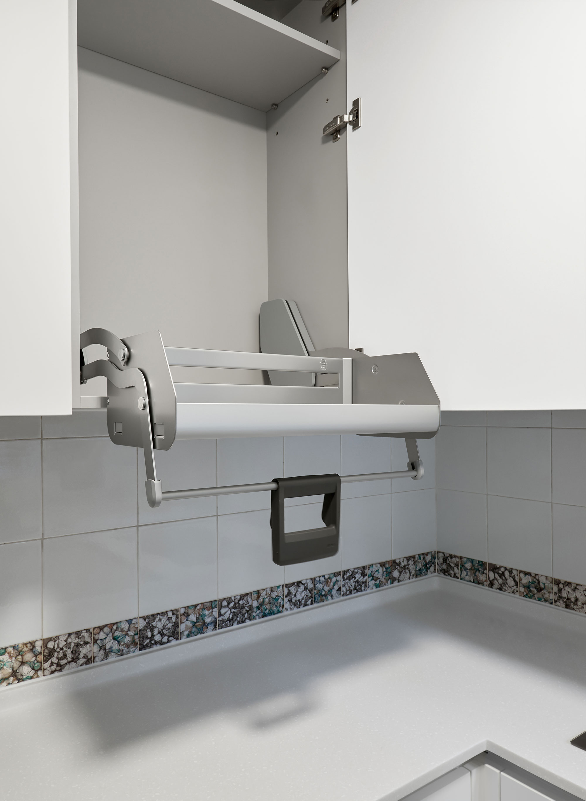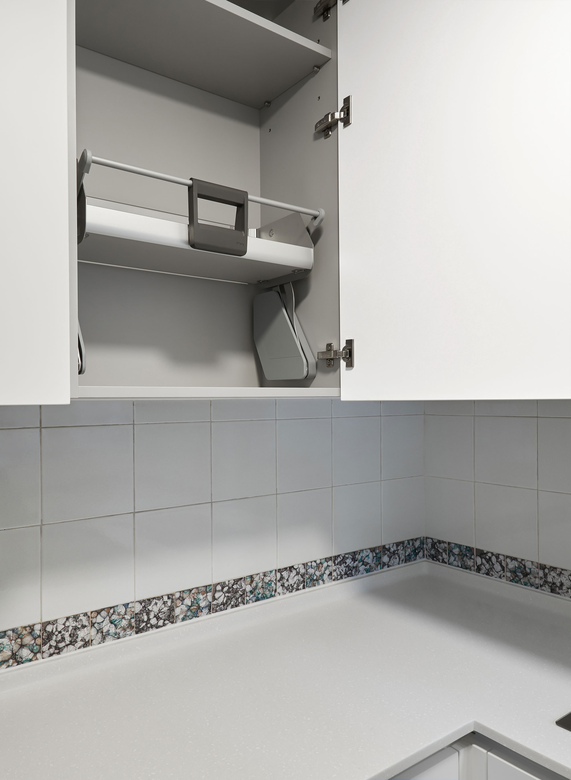 Incorporating a stepper into the base cabinet's toe kick can serve dual purposes: it can function as a step for easily accessing items stored in tall cabinets, and it can also act as a small drawer, providing extra storage space for miscellaneous items.