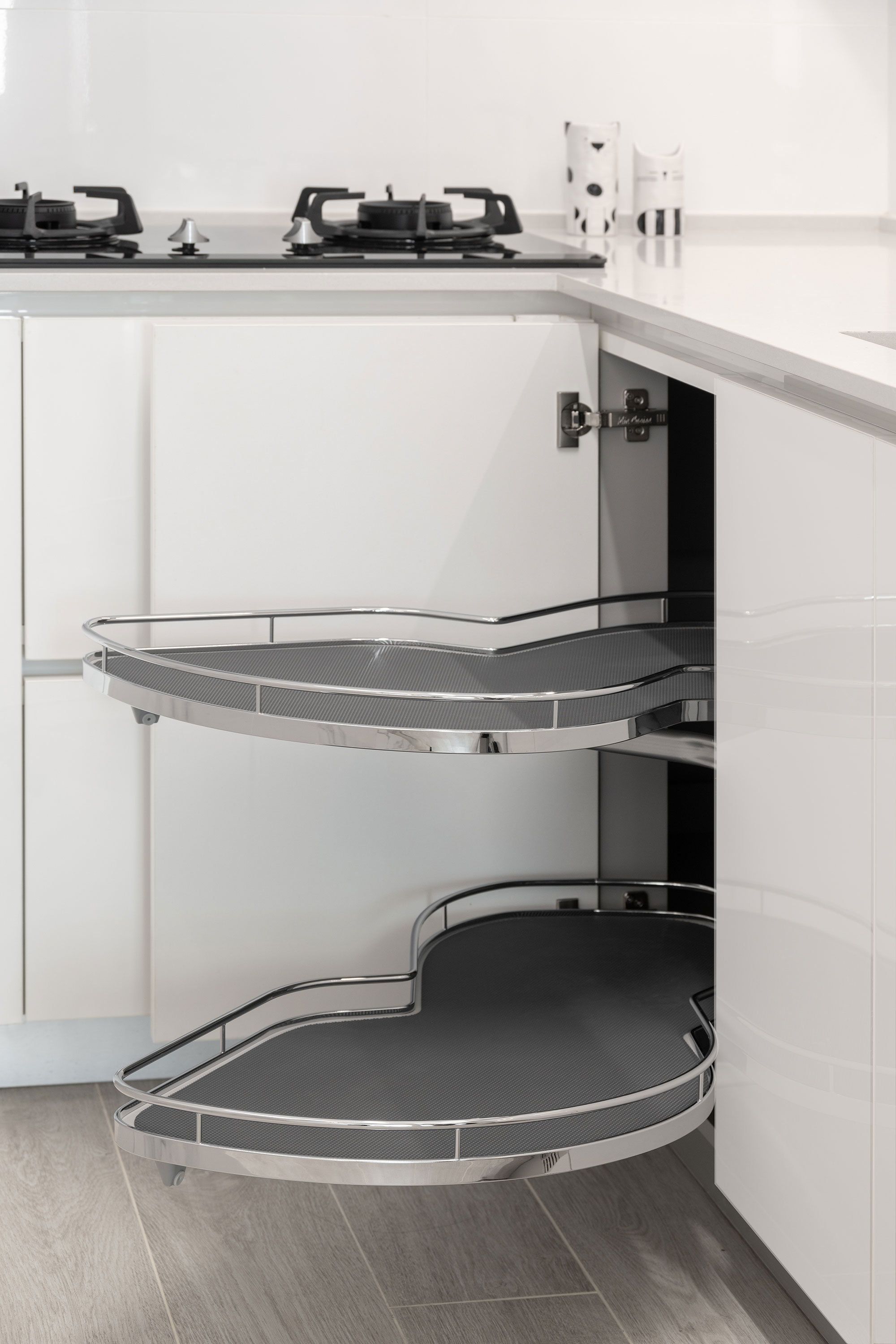 Pull-out baskets are a flexible storage option ideal for placing inside cabinets or drawers. They allow for layered storage of items, making them easy to access. Tall pull-out baskets and corner pull-out baskets can effectively utilize the often-overlooked spaces in tall cabinets and corner units, making it easier to store and retrieve items, thus increasing usable space in the kitchen.