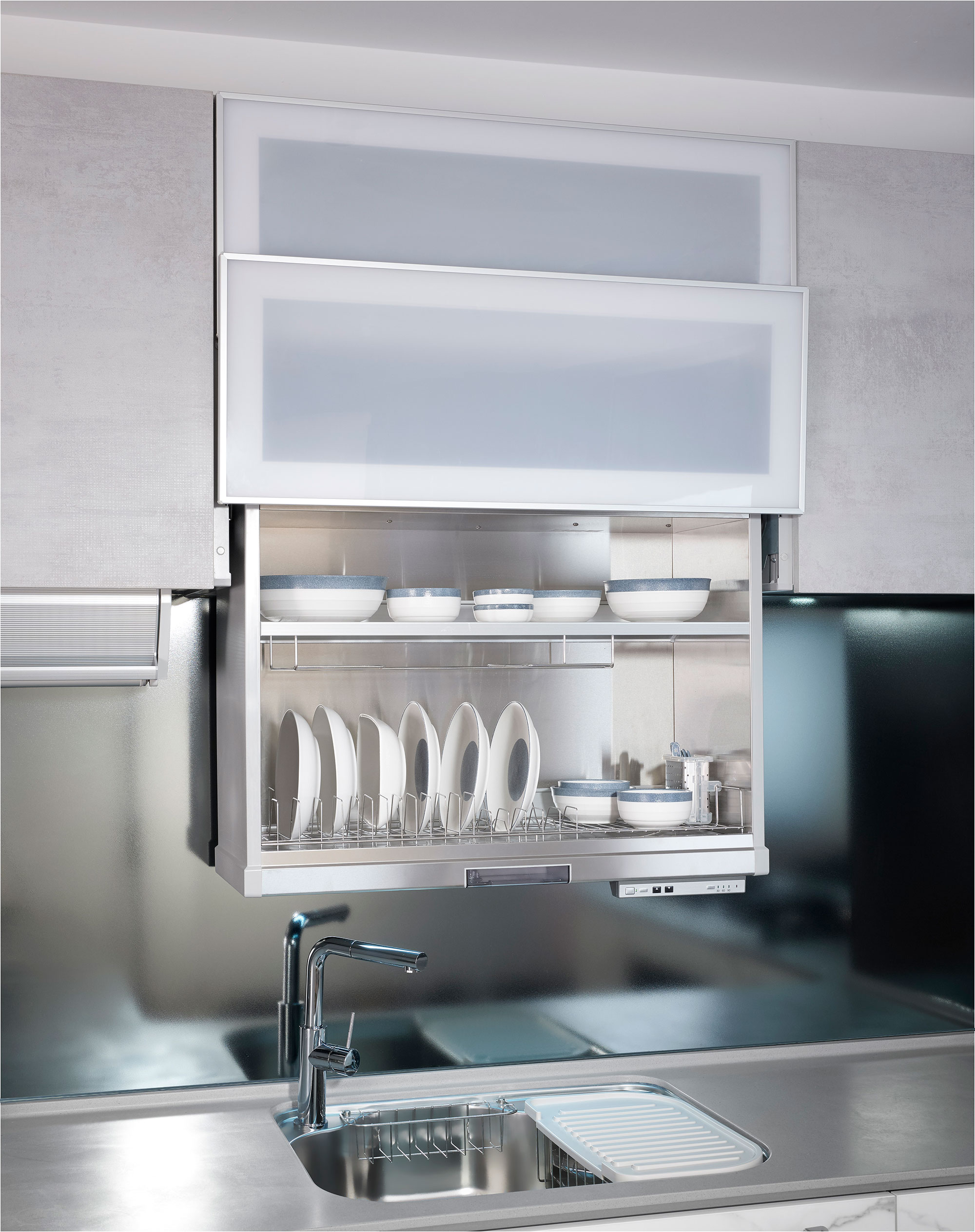 With advancements in technology, installing Automatic Lifting Dish Sterilizer in the kitchen is also a great option. An electric lift cabinet can neatly store dishes and can be raised or lowered at the push of a button, making organization easier and enhancing the kitchen's flexibility.