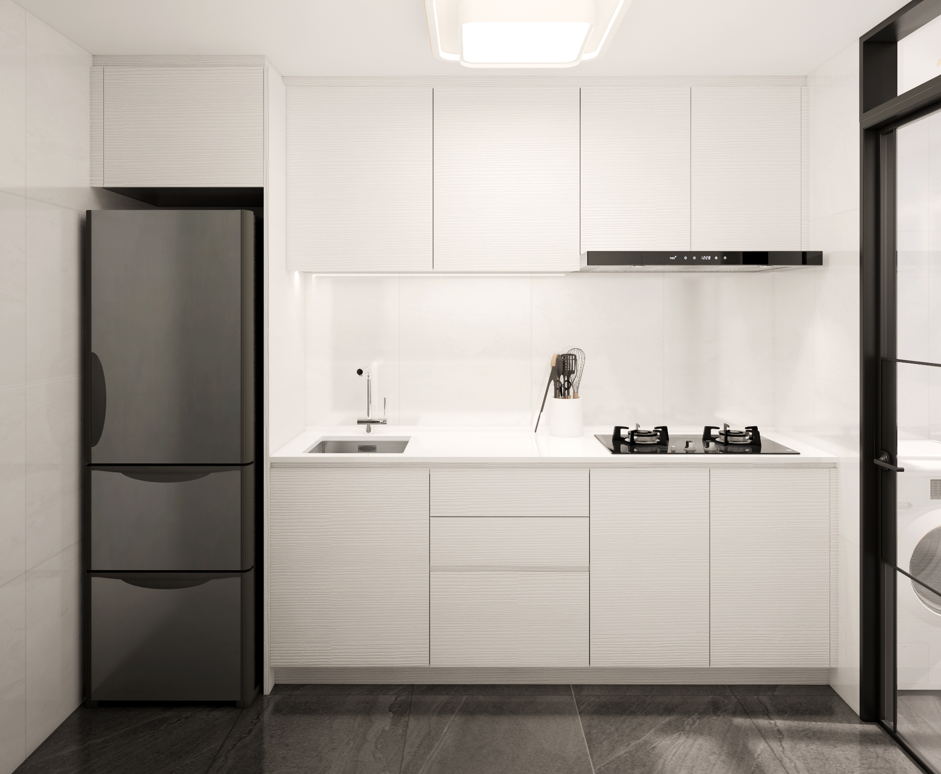 The straight-line kitchen design makes the cooking, preparation, and washing spaces clearly defined, allowing the cooking process to be efficient. Complemented by natural light from the glass sliding door, white is the key tone that instantly brighten the space.