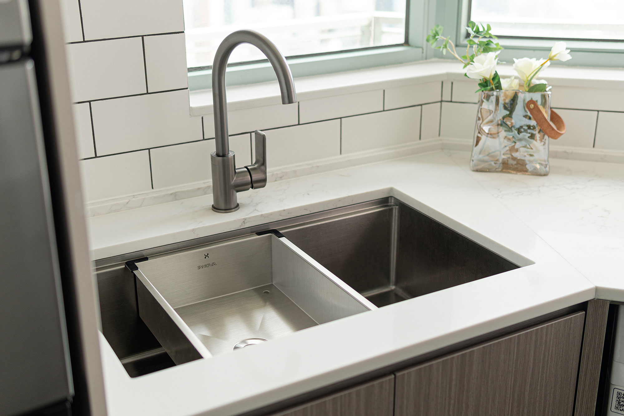 簡約經典的廚房配件能使廚房設計不易過時,在鋅盤、水龍頭、餐具上稍花心思,除了增添一份精緻感,也能讓廚房更為耐看耐用。